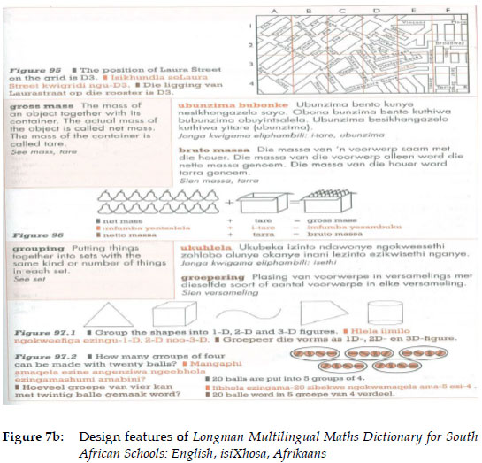 Furthermore, pictorial and diagrammatical illustrations prove to be useful in conveying meaning information, especially in the scientific and practical disciplines. The Illustrated Glossary of Southern African Architectural Terms: English-isiZulu and the Longman Multilingual Maths Dictionary for South African Schools: