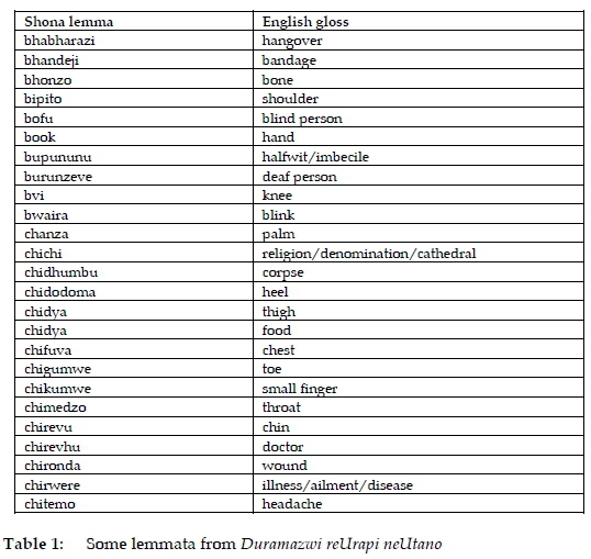 At the beginning of this section it was asserted that lemma selection decisions will, to a large extent determine whether the final product would be a specialized dictionary or general-purpose dictionary. As in the case of the music terms dictionary discussed above, one may indeed wonder about the inclusion of the twenty-five lemmata identified from the Shona biomedical terms dictionary listed in Table 1 below: