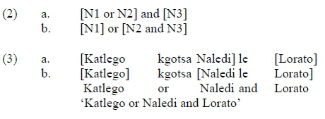 We conducted a production study that involved a well-established elicitation method for prosodic boundaries in languages like English and German (e.g., Kentner and Féry 2013; Petrone, Truckenbrodt, Wellmann, Holzgrefe-Lang, Wartenburger and Höhle 2017; Turk and Shattuck-Hufnagel 2007). The stimuli comprised lists of three proper names coordinated by the conjunctions "or" (kgotsa in Tswana) and "and" (le in Tswana). Such lists allow for either a left-branching structure, as illustrated in (2a), or a right-branching structure, as illustrated in (2b). The sentences in (3) are examples from Tswana with the corresponding structure.2 Prior studies on English and German employing such a design found that speakers use prosodic phrasing for structural disambiguation, inserting a phrase boundary after N2 in the left-branching case (2a) and after N1 in the right-branching case (2b) (see, e.g., Petrone et al. 2017 for German). Several consultations with native speakers of Tswana suggested that such structures are well-formed in Tswana and that prosodic phrasing constitutes a means of resolving the ambiguity.