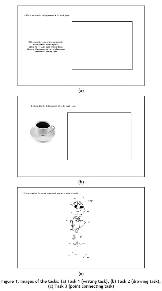 All participants performed three tasks. Task 1 was to write a given sentence in the same way (writing). Task 2 was to draw a given still life figure (drawing). Finally, Task 3 was to connect lines along given points (point connecting). In this task, an unfinished picture was presented to participants that was completed by connecting the points in numerical order. Participants were instructed to complete the picture as quickly as possible, with each line being as straight as possible. Figure 1 shows each task.