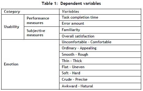 In a study on the perceptual dimension of the tactile texture, the perceptual dimension is composed of words expressing the four tactile senses of 'smooth/rough', 'thin/thick', 'uneven', and 'hard' [24]. In addition, 'comfortable' and 'appealing' were used as emotional variables in studies evaluating the usability of typical mobile stylus pens [25]. Finally, a previous study was conducted to find the emotional factors that affect users' satisfaction with an analogue pen. Five emotional factors - 'comfortable', 'precise', 'deep', 'natural', and 'refined' were found to increase satisfaction with the pen [26].