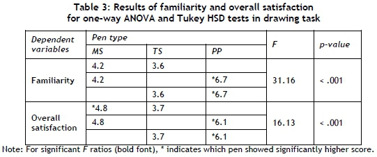 Familiarity and overall satisfaction were measured in TS, MS, and PP. A one-way ANOVA and a Tukey HSD test were conducted for each writing task and drawing task. There was a difference in familiarity and overall satisfaction in the writing task (Table 2). In the case of familiarity, scores were higher in the order of PP (M = 6.7, SD = .54), MS (M = 4.4, SD = 2.04), and TS (M = 3.3, SD = 1.73), and the difference among these pens was statistically significant (MS-TS, p = .030, PP-MS, p < .001, PP-TS, p < .001). In the case of overall satisfaction, the scores of PP (M = 5.7, SD = 1.23) were higher than those of TS (M = 3.6, SD = 1.43) and MS (M = 4.2, SD = 1.67) (ps <.001), but there was no difference between TS and MS (p = .130).