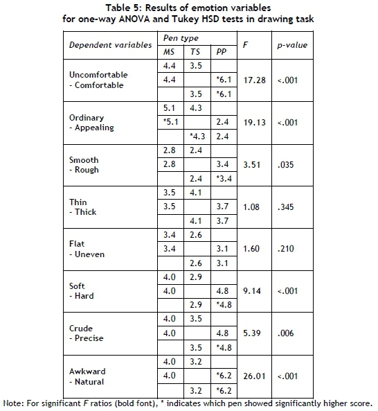 One-way ANOVA and Tukey HSD tests were conducted to analyse emotional variables for each writing and drawing task. The results of the analysis for the writing task are shown in Table 4. In the case of uncomfortable-comfortable, PP (M = 5.8, SD = 1.36), MS (M = 4.4, SD = 1.76), and TS (M = 3.0, SD = 1.45), in that order, provided more comfortable emotion (PP-MS, p = .003, PP-TS, p < .001, MS-TS, p = .004). In the case of awkward-natural, PP (M = 6.3, SD = 1.00), MS (M = 4.2, SD = 1.93), and TS (M = 3.0, SD = 1.73), in that order, provided more natural emotion (PP-MS, p < .001, PP-TS, p < .001, MS-TS, p = .022).