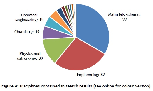 Titanium and its applications cover diverse disciplines. A total of 15 different disciplines were identified from the search results. This can be expected from the results, as titanium metal is used in a broad spectrum of applications. The proportions of the disciplines are displayed in Figure 4.