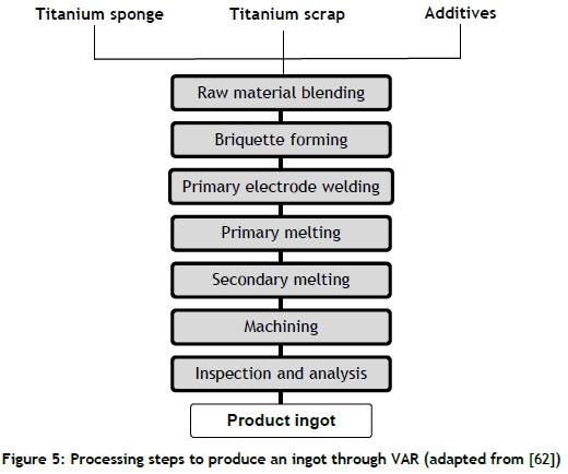 Titanium sponge is still a crude form of titanium metal, and it has to undergo heat treatment processes to become a usable form of titanium or titanium alloy [74]. Titanium has a strong affinity for oxygen and nitrogen; therefore titanium sponge cannot be melted in conventional refractories [62]. The result is that titanium sponge needs to be melted in a water-cooled copper crucible that is either in a vacuum or in an inert atmosphere [62]. Processes to melt titanium are electron-beam remelting (EBR), vacuum arc melting and remelting (VAR), plasma arc remelting (PAR), and electro-slag remelting (ESR) [62,65]. Heat treatment allows for the production of homogeneous electrodes that can then be processed into ingots, blooms, billets, or slabs of titanium and titanium alloys [65]. To illustrate the processes involved in the production of ingots, the process flow of a VAR furnace is shown in Figure 5.