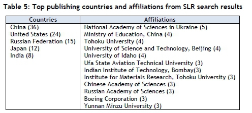 It is important to note that the top five countries are also well-known for their involvement in the various stages in the titanium metal industry; however, this falls outside of the scope of this study. Another important observation is that most of the affiliations are universities or tertiary institutions, except for Boeing Corporation. Boeing is one of the leading companies in the aerospace field, and it is interesting to note that this company is also invested in titanium research. Aerospace is one of the leading industries for the consumption of titanium metal.