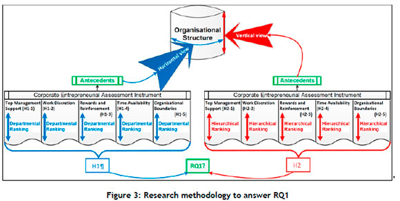 As can be seen in Figure 3, the corporate entrepreneurial assessment instrument (CEAI) was used to measure the five specific antecedents of CE, namely top management support, work discretion, rewards and reinforcement, time availability, and organisational boundaries. These five categories constituted the enabling dependent variables in order to answer RQ1. The enabling dependent variables measured through the CEAI were first ranked (using a five-point Likert scale of agreement) across the departments of the organisation in order to test H1. Then the enabling dependent variables were ranked across the hierarchical structure of the company to test H2.
