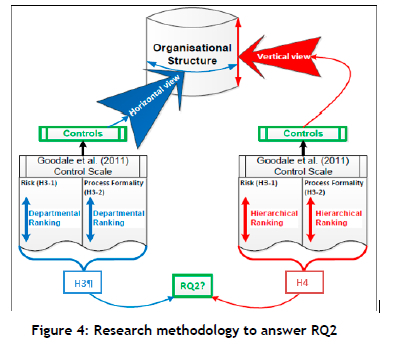 As can be seen in Figure 4, the control scales developed by [28] were used to measure the two specific controls of CE, namely risk and process formality. These two categories constituted the controlling dependent variables in order to answer RQ2. The control dependent variables were first ranked across the departments of the organisation in order to test H3. Then those variables were ranked across the hierarchical structure of the company to test H4. Before any data was gathered, an ethical clearance process was followed, in which the questions were first presented to the senior management of the target organisation, and then approval was obtained from both that senior management and the ethics committee of the university.