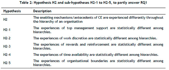 Hypothesis 2 stated that the enabling mechanisms/antecedents of CE would be experienced differently throughout the hierarchy of an organisation. Five hypotheses were originally posited, of which three were positive, namely H2-1, H2-2, and H2-3.