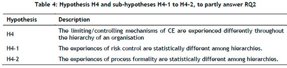 Hypothesis 4 stated that the limiting/ controlling mechanisms of CE would be experienced differently throughout the hierarchy of an organisation. Two hypotheses were originally posited to support this statement. Although both were internally consistent, process formality was discarded through null-hypothesis testing, and risk control was found to be positive.
