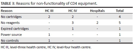 RESULTS: A total of 38 CD4 test analysers were assessed. Of these, 26 (68%) were functional. In hospitals, 85% of CD4 analysers were functional, in HC IVs, 67% were functional and in HC IIIs, 43% were functional. The differences did not reach statistical significance. In the Lango sub-region, 72% of analysers were functional; in the Acholi sub-region, 65% were functional. Non-functionality was mainly due to lack of reagents and cartridges, as well as low staffing levels of laboratory technicians with the skills necessary to operate the equipment.