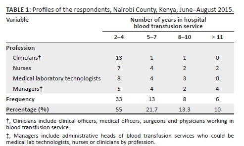 METHODS: A descriptive, cross-sectional study design was used. Sixty health workers were selected as respondents from 15 hospitals that provide blood transfusion services in Nairobi County. The data collection period was from June to August 2015 and the data were analysed in 2016