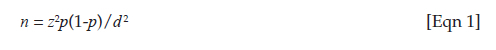 where n = minimum sample number, z = confidence interval at 95% (1.96), p = prevalence level of subject (3.5%), and d = level of precision (2%). A sample size of 324 was determined, and a 10% non-contingency was added to make up for non-response, giving a minimum target sample size of 360.
