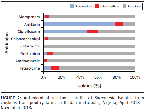 Antimicrobial resistance is an emerging global threat associated with the reduced efficacy of antimicrobials in the treatment of human and animal infections, prolonged morbidity, and death.16 Multidrug-resistant organisms are an increasing challenge to human and livestock health worldwide, and Nigeria is not excluded from the antimicrobial resistance burden. Antimicrobials are used in veterinary practice as growth promoters, prophylactics or therapeutics. The indiscriminate use of antimicrobials has been linked to increased antimicrobial resistance among bacterial pathogens isolated from poultry and the poultry environment, including Salmonella.17 Therefore, poultry may harbour multidrug-resistant pathogens, which could be transmitted to human populations anywhere through direct contact or by consumption. Hence, our study focused on determining the occurrence and antimicrobial susceptibility patterns of Salmonella isolates from chickens in poultry farms in Ibadan, Oyo State, Nigeria.