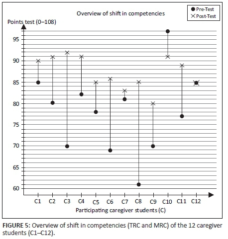 The increase in the median from pre- to post-test underlines the shift in competencies in the caregiver students. The decrease in the IQR and therefore the decrease in dispersion indicates that the group became more homogeneous with regard to their TRC and MRC. Analysis of the results shows a significant increase in competencies after training in both TRC and MRC. One caregiver student (C10) showed a decrease in competencies post-training; however, she had already scored very highly in the pre-test compared with the rest of the group (97/108 points). Also in the post-test, this student ranked among the best in the group (91 points). The same applied to another caregiver student (C12), who obtained the same number of points (85 points) before and after the training.