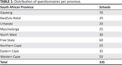 The research population for this study consisted of principals and senior and novice teachers affiliated with the South African Teachers Union at 350 primary and secondary schools. The Union wished to obtain a better understanding of teachers' needs in the participating schools and selected about 12% of the affiliated schools. These comprised urban, suburban, multicultural, English-medium, Afrikaans-medium, parallel-medium and dual-medium schools. It also included high schools, primary schools, special-education schools as well as technical and agricultural schools. The SATU secretaries in the respective provinces were requested to compile a list with a selection of schools. The study relied heavily on the cooperation of schools affiliated with SATU. In order to achieve a representative and reliable response, it was important for participants to realise the need for such a study, and SMSs and emails were sent out on several occasions, reminding participants to complete the questionnaires. Table 1 indicates the distribution of participating schools in the respective provinces.