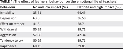 The participants (teachers) were requested to indicate the extent to which learners' behaviour impact on their emotional life and the extent to which it influenced their quality of life. Aspects investigated were depression, irritability, effect on temper, a feeling of withdrawal, aggression, a tendency to cry and impatience.