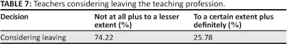 Assuming that teachers experience excessive stress because of disciplinary problems within the school, the question arises whether these teachers might consider leaving the teaching profession as a result. The responses to this question are reflected in Table 7.