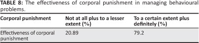 More than 50% of the participants indicated that they would prefer to use corporal punishment as a disciplinary measure in extreme cases, and it is suggested that this preference should be investigated. The debate on this issue has not yet been settled.