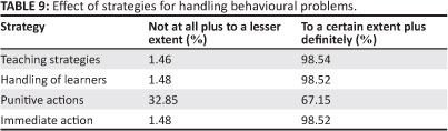 Almost all of the participants (more than 98%) agreed that teaching strategies, the way in which learners are handled and immediate action are the most effective tools to manage behavioural problems. This finding is in accordance with that of Gomez and Ang (2007:98). A high percentage (67.15%) of the participants viewed punitive actions as effective strategies to deal with behavioural problems. This is in line with the 79.2% of participants who still regard corporal punishment as the most effective way to maintain discipline. Teaching strategies, the handling of learners and immediate action are skills in which beginner teachers need to be trained. It should form part of the planning and needs to be prioritised and implemented by school-management teams.
