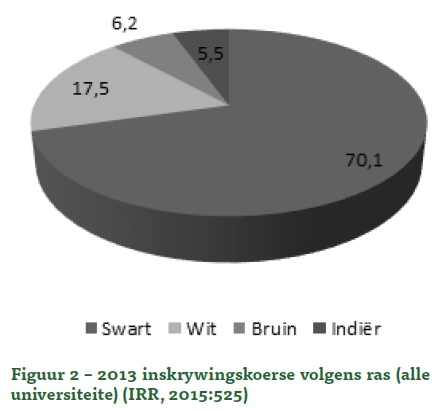 Die realiteit is dat die hoër onderwys landskap reeds grootliks demografies "getransformeer" is, en met verloop van tyd toenemend so sal word. 'n Vergelyking van inskrywingskoerse volgens ras skets die volgende beeld (IRR, 2016:524):