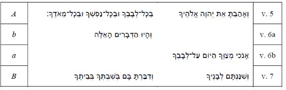 (lēḇāḇ / dāḇār). The above has implications for understanding the unity of the passage Deuteronomy 6:4-9. The first part vv. 4-5 deals with the content of the instruction, namely the Shema, while the second part (vv. 7-9) contains the manner of the instruction, with v. 6 acting as a transitional verse between these two parts.
