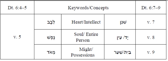 The discussion regarding the two parts of Deuteronomy 6:4-9 permits a synthesis of the two parts of the text, vv. 4-5 and 7-9, revealing three dimensions of the command to love YHWH in Dt. 6:5 as illustrated below: