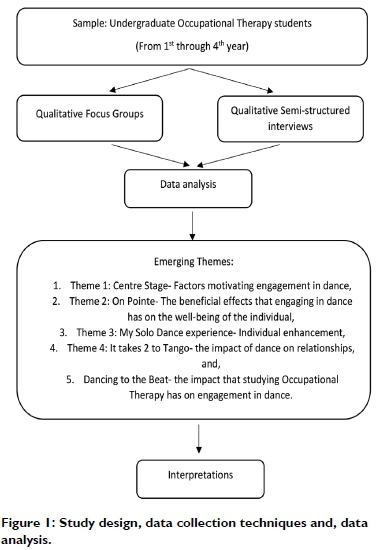 The purpose of this study was therefore to explore the various meaning/s attached to dance as an occupation by undergraduate occupational therapy students, to explore whether engagement in the occupation of dance has an impact on well-being. Furthermore, the study aimed to explore the impact that the occupation of studying has on undergraduate occupational therapy students' engagement in the occupation of dance.