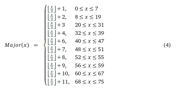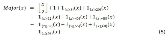 The derivation of the major address calculation, (4), was done by moving the slice horizontally across the FPGA floorplan. The offset added to each calculation is dependent on other columns, such as RAM, DSP and I/O, situated between the CLBs. Again, this equation can be simplified by using the indicator function as shown in (5).