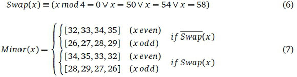 While moving the slice horizontally across the FPGA floorplan, an interesting phenomenon was observed; the configuration of every fourth column was byte-swapped. For even columns, the minor addresses [32, 33, 34, 35] were swapped to [34, 35, 33, 32] and for uneven columns minor addresses [26, 27, 28, 29] were swapped to [28, 29, 27, 26]. Castellone (2011) found that columns 30, 96 and 97 break this convention and also swap on the Virtex®-5 VLX110T. On the contrary, it was found that columns 50, 54 and 58 are swapped on the VFX70T. After further investigation, it was ascertained that these columns are SLICEMs on the respective devices. As a result, the byte swapping can be ascribed to a difference in encoding between SLICEL and SLICEM. Using this information, it is possible to determine whether the frame should swap using (6). In this Boolean equation, Swap is a binary variable that is only true if the bytes of the LUT configuration are permuted. From this, the composition and order of the minor addresses are given by (7).