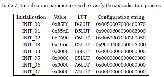 To verify the operation of the specialiser, consider a LUT primitive with the initialisation parameters and primitive listed in the first three columns of Table 7. Using a truth table a Boolean expression for each of the initialisation values can be derived. Next, the configuration parameters derived in Section 5 and listed in Table 4 are substituted into these expressions to yield the configuration strings given in the last column of Table 7.