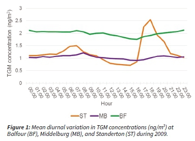 In general, measured concentrations were within the Northern Hemisphere range of 1.5-1.7 ng/m3 and 1.2-1.4 ng/m3 observed at Cape Point, South Africa. The seasonal variation between sites suggests that meteorology had a profound influence on TGM concentrations. Diurnally, no profound variations were observed at Balfour and Middelburg and this may be ascribed to sparse regional sources. At Standerton, however, the observed diurnal variation suggests a significant influence from local domestic coal combustion.