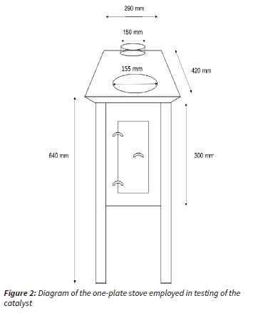The experimental setup consisted of a commercial one plate combustion device with a flue as shown in Figure 2 (Ndebele Appliances and Coal Stoves, Bronkhorstspruit, South Africa), which is representative of cooking stoves available in South Africa.