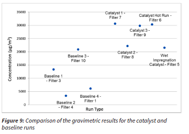 The total particulate concentrations were measured gravimetrically and the particle mass concentration of the catalyst runs were found to be higher than for the baseline runs. EDX analysis indicated that the increased particulate concentration on the catalyst runs was not likely to be as a result of macroscopic particles of the catalyst being dislodged from the support, as no manganese was detected. The catalyst therefore had good adherence to the catalyst support.