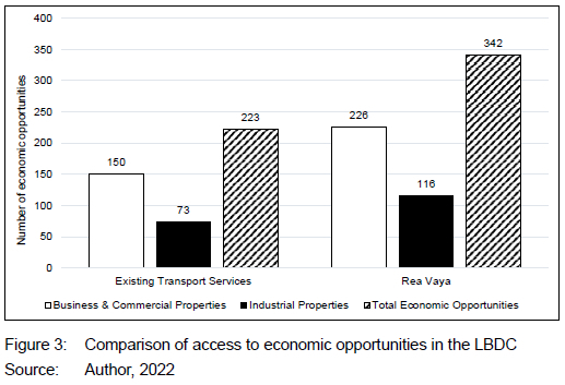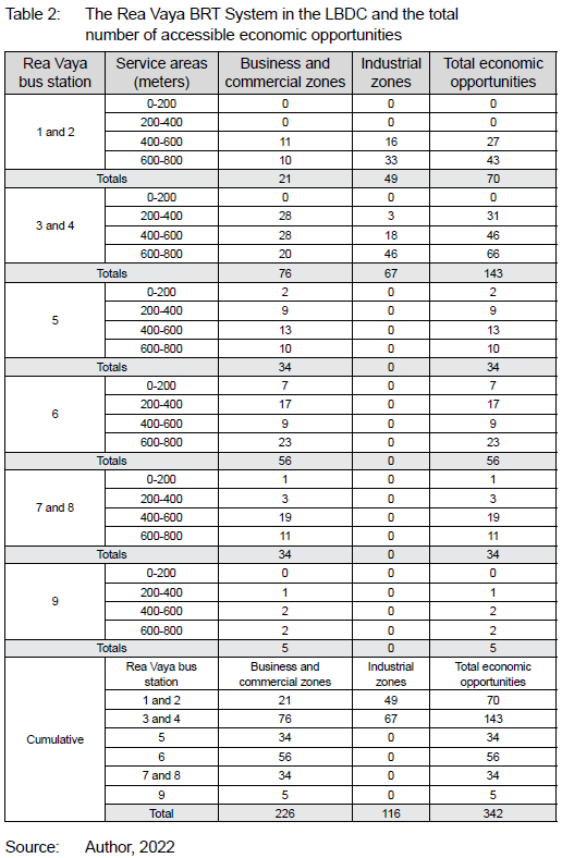 Since 455 business and commercial-zoned properties, and 270 industrial-zoned properties were identified in the LBDC, it was found that Rea Vaya bus stations 1 and 2 provide access to 70 economic opportunities, providing access to 5% of business and commercial-zoned properties, 18% of industrial-zoned properties, and 10% of all economic opportunities in the corridor.