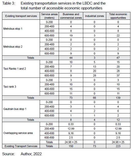 Taxi ranks 1 and 2 were examined together because of their close proximity to one another and the subsequent overlapping of their service areas. They were found to provide access to 100 economic opportunities, which accounts for 7% of business and commercial-zoned properties, 24% of industrial-zoned properties, and 14% of all identified economic opportunities in the LBDC. Taxi rank 3 provides access to 39 economic opportunities, which accounts for providing access to 9% of business and commercial-zoned properties, zero industrial-zoned properties, and 5% of all the identified economic opportunities in the LBDC. Taxi rank 4 provides access to 4 economic opportunities, which accounts for 1% of business and commercial-zoned properties, zero industrial-zoned properties, and 0.5% of the identified economic opportunities in the LBDC. Gautrain bus stop 1 provides access to 12 economic opportunities, which accounts for 2% of business and commercial-zoned properties, 1% of industrial-zoned properties, and 1.7% of all identified economic opportunities in the LBDC. Gautrain bus stops 2, 3 and 4 were examined together because of their close proximity to one another and the subsequent overlapping of their service areas. As such, Gautrain bus stations 2, 3 and 4 provide access to 24 economic opportunities, which accounts for 5% of business and commercial-zoned properties, zero industrial-zoned properties, and 3% of all identified economic opportunities in the LBDC. The existing transportation services (taxi ranks, Gautrain Bus, and the Metrobus) in the LBDC provide access to 150 business and commercial-zoned properties, accounting for 33% of all identified business and commercial facilities in the corridor. The existing transport services also provide access to 73 industrial-zoned properties in the corridor, accounting for 27% of all identified industrial facilities in the LBDC. In total, as per Table 3, access is provided to 223 economic opportunities in the LBDC, accounting for 31%.
