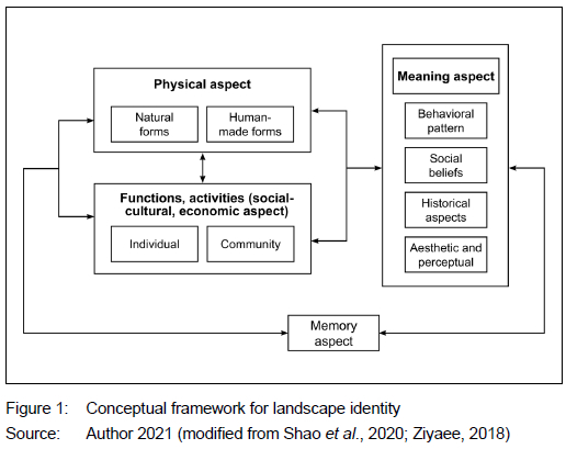 Figure 1 shows the conceptual framework for landscape identity and the three aspects that form identity, i.e. the physical aspects, functions and activities, and meaning, together with the resultant memory associated with the landscape.