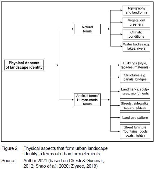 According to Shao et al. (2020: 6), the phrase 'physical aspects' is used to describe the surrounding geographical features, as well as other visible features such as the styles of architecture and the natural environment. These forms act as the medium for interaction between people and their surrounding environment. Stobbelaar and Hendriks (2004: 2) state that the physical aspect acts as the primary means that reflects the relationship between personal identity and the identity related to the space. The physicality of all identities is the most basic and easily explored aspect. Ziyaee (2018: 24) divides the physical aspect of landscape identity into natural forms and human-made forms, while Okesli and Gurcinar (2012: 38) refer to "natural" and "artificial" attributes. The natural attributes can be summarised as topographical and hydrographical characteristics, and climatic and flora characteristics, while the artificial attributes consist of settlement components such as buildings, streets, and city squares. These human-made forms include the shape of spaces, access, buildings, and objects such as street furniture (Ziyaee, 2018: 25). Although all physical components could contribute meaning, the human-made components are considered to be more symbolic.