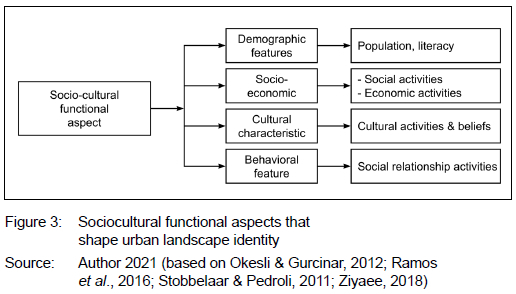 Shao et al. (2020: 6) state that social activities play a critical role in the formation of existential identity within urban landscape identity. Social activities help build the bond between residents and the local area where they dwell through experience and memories. Activities integrate people's needs into spatial functions that make places unique (Shao et al., 2020: 6). According to Stobbelaar and Pedroli (2011: 328), places used by the local population for celebratory, commemorative, or recreational activities and events may become part of the cultural-existential landscape identity. Ziyaee (2018: 24) considers the sociocultural as an immaterial component of landscape identity that includes social beliefs in terms of events and festivals, behavioral patterns and rules such as the separation of activities and forbidden activities. Figure 3 summarises these sociocultural aspects.