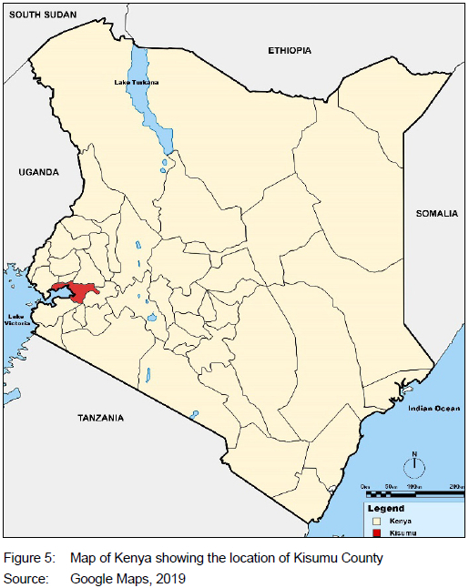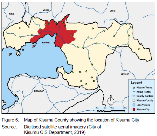 The study was conducted in Kisumu City, the third-largest urban area in Kenya. According to the Kisumu Integrated Sustainable Urban Development (ISUD) Plan Part 1 (AFD, 2013),1 Kisumu is the main administrative centre and headquarters of Kisumu County, and is 265km north-west of Nairobi. It lies on the eastern shores of Lake Victoria, the continent's largest freshwater lake. It is 1 146 m above sea level and is located 0o6' south of the equator and 34o45' east (AFD, 2013: 18). In 2022, the city covered an area of 417km2 (157km2of water and 260km2 of land) with a population estimated at over 500 000 people (Wamukaya & Mbathi, 2019: 81). According to Kenya's National Bureau of Statistics (KNBS, 2019: 20), Kenya's population and housing census of 2019 determined the study area (the Kisumu town area and its outskirts) to fall within the Kisumu Central Sub-County, which has a total population of 174 145, consisting of 84 155 males (48.3%), 89 985 females (51.7%), and 52 331 households. The Kisumu town area has a total population of 56 498 people and 17 258 households within a land area of 25.4km2. Sub-locations within the Kisumu town area include Kaloleni, Bandari, Southern, Northern, and Kanyakwar.