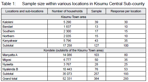 The Kisumu town area and the immediate neighborhoods surrounding the town area have undergone urban renewal and the households located within these two areas formed the population for this study. The KNBS' housing population census of 2019 showed 17 258 households located in Kisumu's central town area, and 35 073 households in the Kondele location on the outskirts of the Kisumu town area (see Table 1). Using simple random sampling, 384 household heads were selected to participate in the questionnaire survey because they were permanent residents within these neighborhoods, users of the renewed spaces, and aged 18 years and older. This ensured that the respondents had a heterogeneous socio-economic character. Similar studies that have used simple random sampling in the collection of data through field surveys include Baris et al. (2009: 725), Layson and Nankai (2015: 70-71), as well as Oktay and Bala (2015: 208).