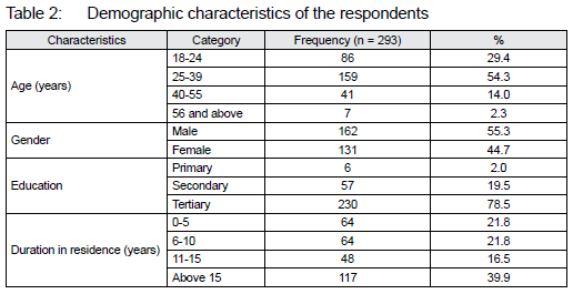 Results on the demographic characteristics in Table 2 indicate that the vast majority of the respondents were male (55.3%), aged between 25 and 39 years (54.3%) and had a tertiary education (78.5%). Of the respondents, 98% were educated beyond primary school, as supported by the situational analysis report of the City of Kisumu (2019: 64), which indicated that over 70% of the residents in Kisumu City had at least a high school education. They were, therefore, expected to respond adequately to the study questions about the effect of urban renewal projects on the elements that form the city's image in Kisumu at the time of the study. Just over half (56.4%) of the respondents had resided in Kisumu for 11 years or longer, indicating that the respondents had lived in Kisumu long enough to respond to the image or character of the city, and possible changes to the city, due to urban renewal and its effects.
