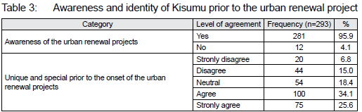 Table 3 shows that, in response to the question on awareness of the urban renewal projects in Kisumu, 95.9% were aware, while 4.1% of the respondents were unaware of the ongoing or completed urban renewal projects in Kisumu. Over half (59.7%) of the respondents agreed (34.1) and strongly agreed (25.6%) that Kisumu had what made it unique and special prior to the onset of the urban renewal project. The implication of this finding to the study is that the vast majority of the respondents agreed that Kisumu had a unique identity prior to the onset of the renewal project.