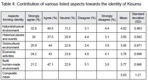 The results in Table 4 show that, with an average mean score rating of 3.83, the respondents agreed that all five aspects formed the identity of Kisumu City. The vast majority of the respondents (81.3%) agreed that the natural/physical environment contributed the most (mean=4.02). Nearly a third of the respondents (68%) agreed that both historical places and events and the sociocultural environment equally contribute (mean=3.85) to the formation of the urban landscape identity of Kisumu.