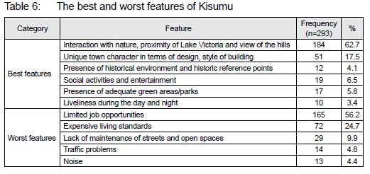 Table 6 shows that 62.7% of the respondents perceived interaction with nature, the proximity of Lake Victoria, and the view of the hills as the best feature of Kisumu. Of the respondents, 56.2% perceived limited job opportunities as the worst and expensive living (24.7%) as the second worst features of Kisumu City. This is in contrast with the earlier result in Table 4 that economic activities contributed to Kisumu's identity.