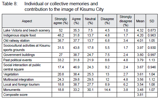 The results in Table 8 show that various aspects of the natural, built/ human-made, and sociocultural environments within the urban landscape of Kisumu evoked individual or collective memories and contributed to the image of Kisumu in terms of its urban landscape identity. With a mean score rating above 4.20, the respondents strongly agreed that Lake Victoria and its beach scenery contributes the most. This confirms the great value that people attach to it in terms of symbolic meaning, as revealed in Table 7. Respondents agreed that indigenous staple food (MS = 4.20), which mostly consists of fish from Lake Victoria, the old railway station (MS = 4.01), and sociocultural activities at the Kisumu sports grounds (MS = 3.97) were the top four contributors to individual or collective memories and their contribution to the image of Kisumu.