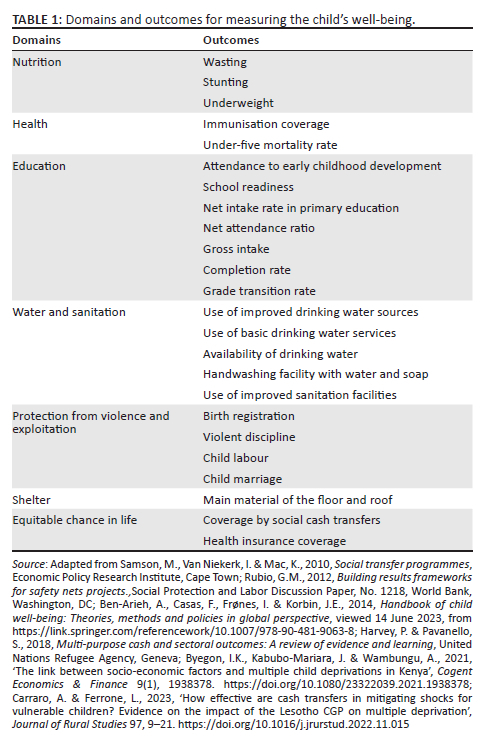 Cash transfer programmes are sometimes questioned regarding their success, with critiques including the careless use of funds or increased dependency by beneficiaries on the state (Sellars 2021). However, there is also evidence of increased nutrition, education, health and productivity following such assistance (Beegle, Honorati & Monsalve 2018; Garcia & Moore 2012; Sellars 2021). Table 1 presents a range of outcomes that may be the intended focus of improved child well-being through a child support programme. The wide range of alternative outcomes makes it more challenging to define the intended results of a child support programme and when the programme would be regarded as successful. Therefore, it is of the utmost importance to ensure that the M&E system of the MGEPESW tracks the specific outcomes of the CSG programme to reflect on the results of the CSG programme. Table 1 presents the domains and related outcomes for measuring the child's well-being in different social protection programme intervention contexts.