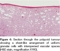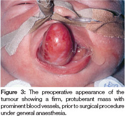 The infant was transferred to the Neonatal Intensive Care Unit at the Children's Hospital at Westmead for observation and a consultation was requested from the specialists in Paediatric Dentistry and Paediatric Surgery. The lesion measured 4x2x2 cms and arose from the alveolus on the right side of the maxillary alveolar gum pad (Figure 3). It was firm on palpation and the surrounding mucosa appeared normal. Large arterial feeder vessels were noted and were consistent with a vascular supply to a lesion of this size. The child was taken to the operating room the following evening to undergo an excisional biopsy of the lesion. The stalk of the lesion was tied off and the tumour completely excised. Haemorrhage was controlled with diathermy. There were no postoperative complications and the child was then transferred back to her mother in the postnatal ward where she was able to successfully breast feed. Healing was uneventful and the upper primary teeth erupted through the site of the surgery at approximately eight months of age.