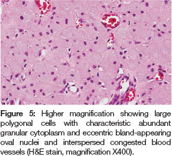 Multiple sections of the lesion stained with hematoxylin and eosin were examined. They showed large polygonal cells containing granular eosinophilic cytoplasm and eccentrically placed nuclei located within a delicate fibrovas-cular connective tissue stroma (Figures 4,5). A diagnosis of CGCT was made.