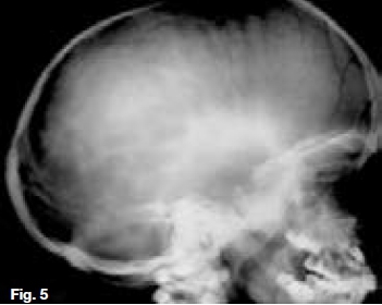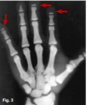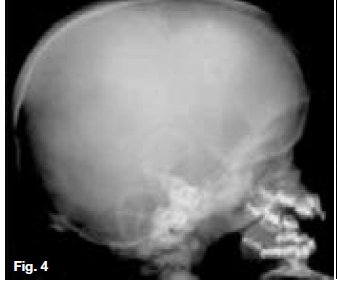 Postero-anterior skull (Fig. 1) and lateral skull radiographs (Fig. 2) showing open anterior fontanelle, dense bones and small maxillary sinuses. In addition, Figure 2 also demonstrates obtuse mandibular angles. The hand-wrist radiograph (Fig. 3) shows incomplete terminal phalanges (red arrows). A diagnosis of Pyknodysostosis was made which is a genetic lysosomal disease characterized by short stature, increased density of the bones, and brittle bones. Other features may include underdevelopment of the tips of the Angers with absent or small nails, an abnormal collarbone (clavicle), distinctive facial features including a large head with a small face and chin, underdeveloped facial bones, a high forehead, and dental abnormalities. These patients are predisposed to osteomyelitis. The diagnosis of Pyknodysostosis is based on physical features and X-ray findings. Figure 4 is a lateral skull radiograph of a patient presenting with bulging of the frontal region of the skull and showing attenuation of the outlines of the dental crypts which is suggestive of a child with vitamin D deficiency. This deficiency results in rickets in childhood and is one of the causes of osteomalacia in adults. Vitamin D acts to increase intestinal calcium uptake, bone calcium mobilization reabsorption.